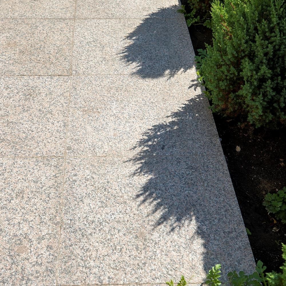 Einer der Vorteile von Santa Rosa Granite besteht in seiner geflammten Oberfläche, die es ermöglicht, in nassen Räumen verwendet zu werden. Für diejenigen, die es noch nicht wissen, ist das Flammen ein Verfahren, bei dem eine Hochtemperaturflamme (über 2000 Grad C) über die Oberfläche aufgebracht wird. Dadurch dehnt sich die Oberflächenschicht aus und blättert ab, wodurch eine raue Oberfläche freigelegt wird, während die Fliese eine Dickenvariation von 1-5 mm entwickelt.