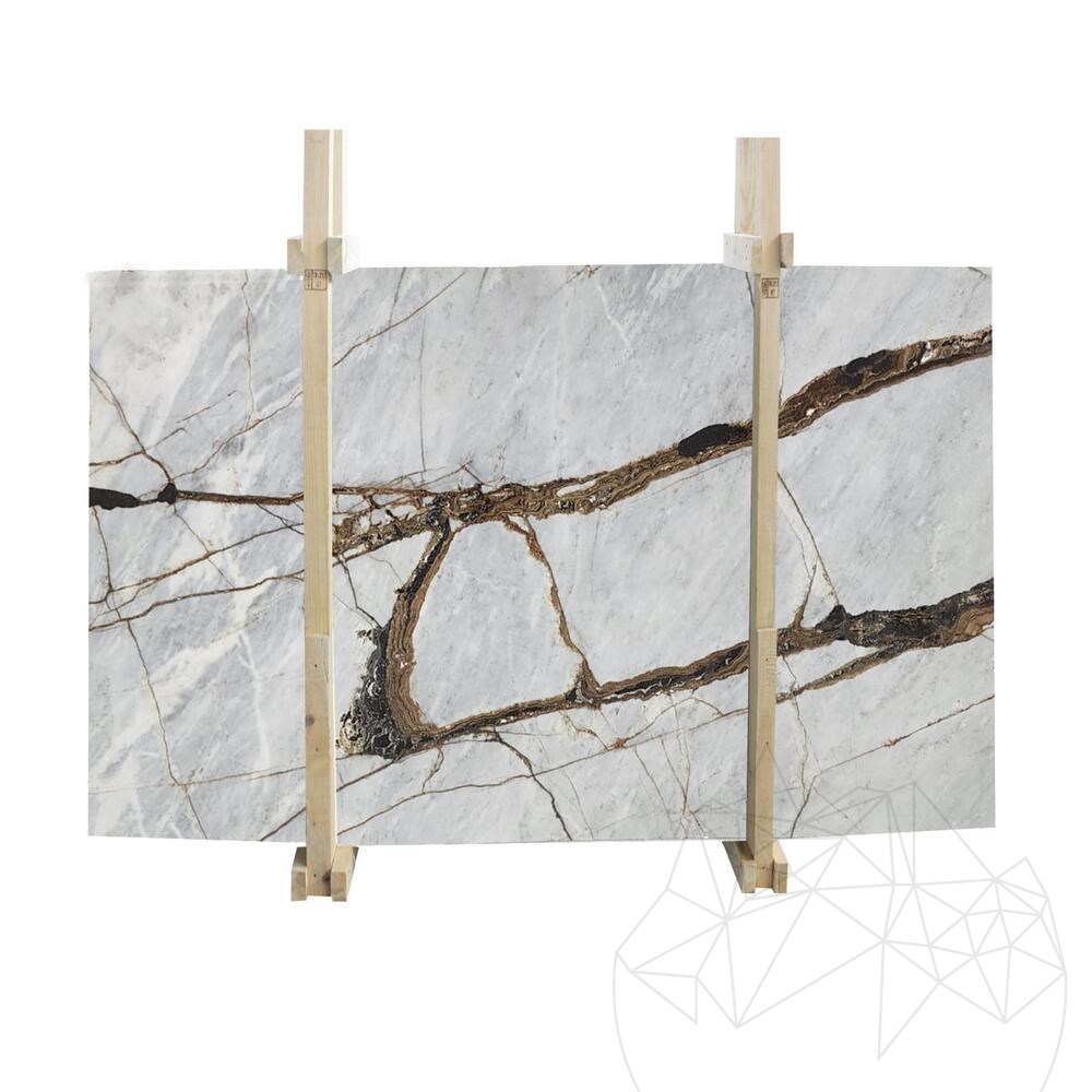 Mit einer Dicke von 2 cm ist diese Platte aus Milano-Marmor robust und langlebig. Das Material eignet sich für eine breite Palette von Anwendungen, von Küchenarbeitsplatten und Innenböden bis hin zu Wandverkleidungen und anderen Designprojekten.