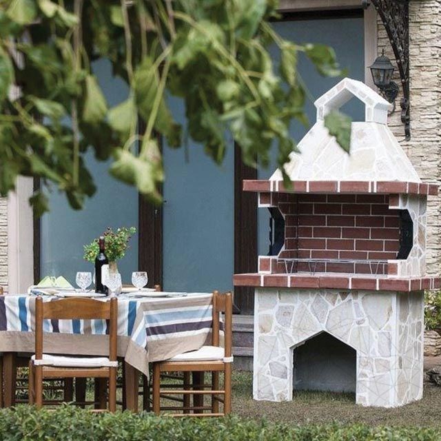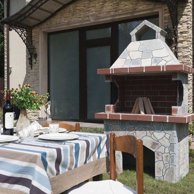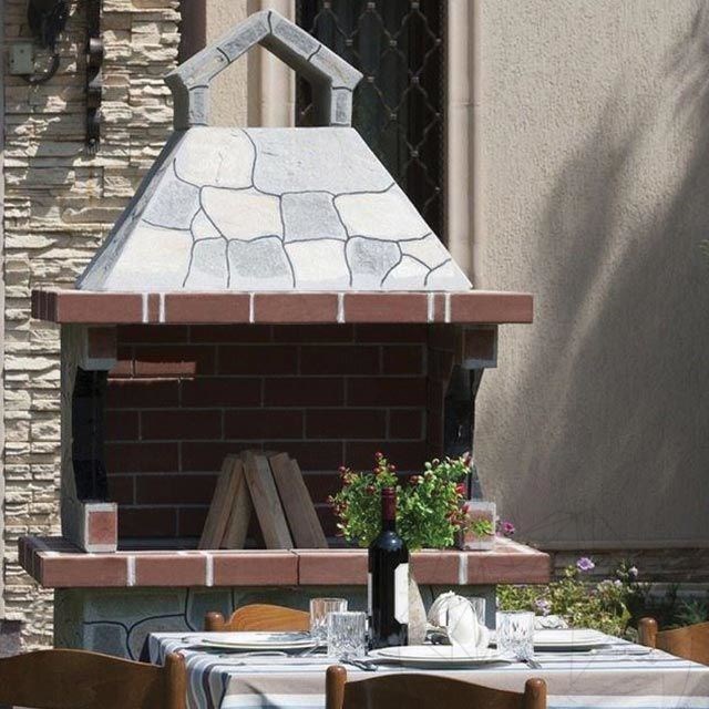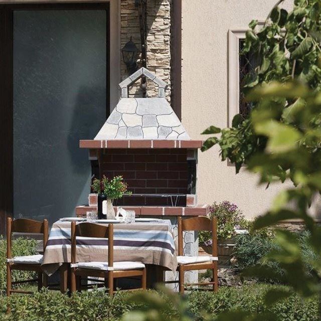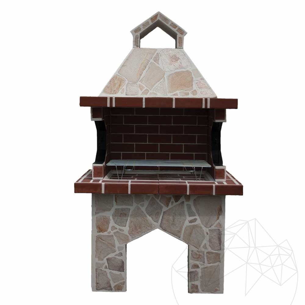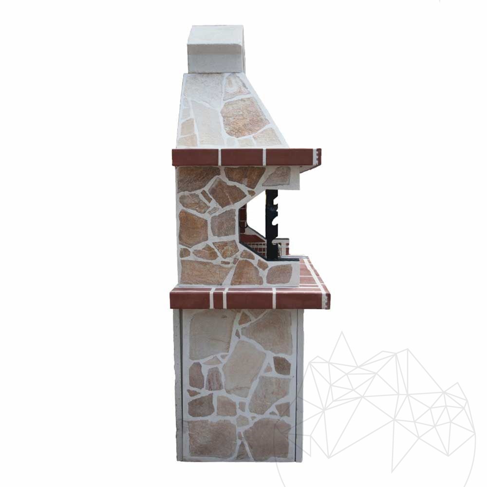 Der standard Medium Grill, der speziell für Holzfeuer gefertigt wurde und mit polygonalem Stein verkleidet ist, wird aus einer feuerfesten Ziegelkuppel zusammengesetzt, die mit thermostabilem Klebstoff auf eine Kammer aus bewaffneten Betonplatten geklebt ist. Außen mit grauem Kavala-Naturstein und goldgelbem Rhodos-Stein verkleidet, kommt der Grill in der praktischen Größe von – 210 x 120 x 80 cm.