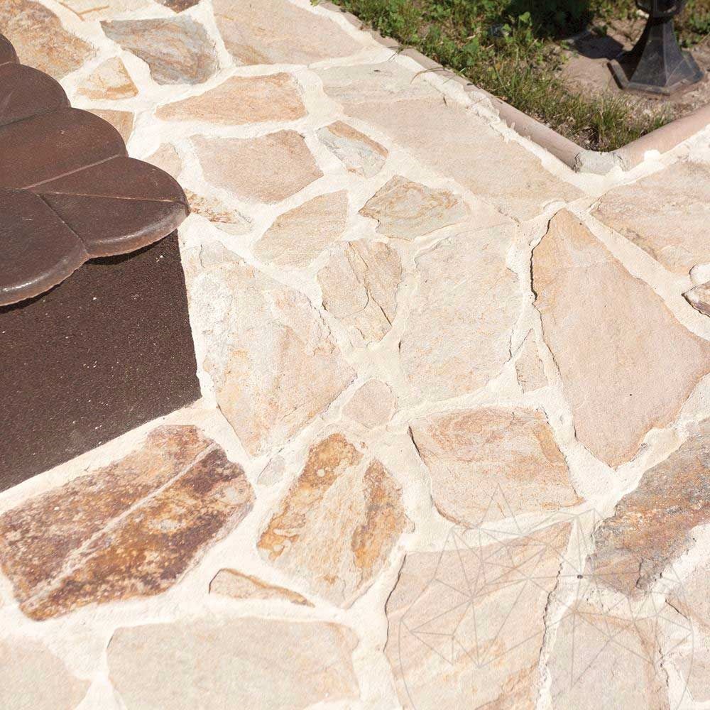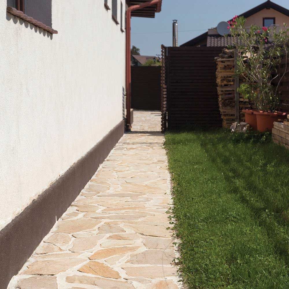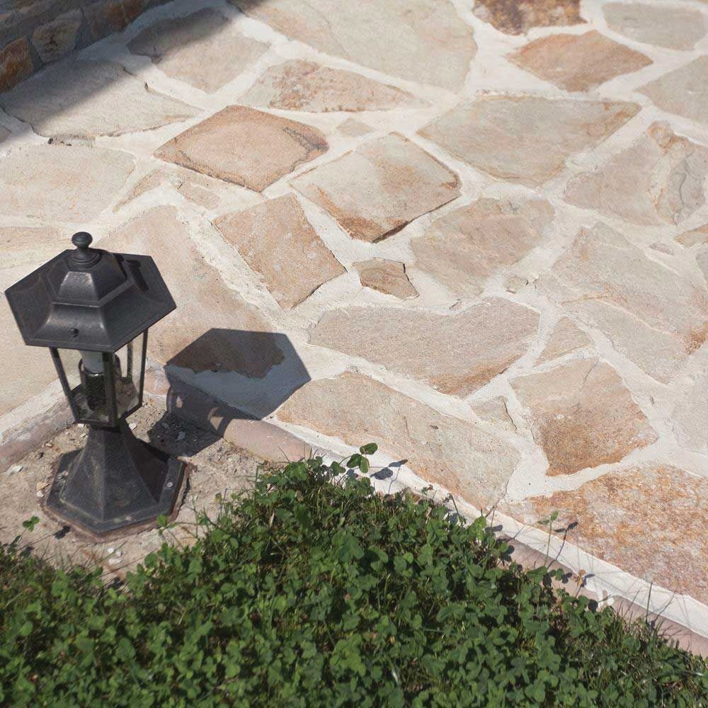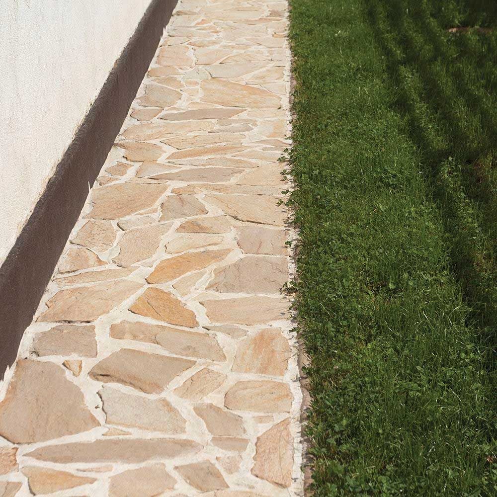 Schiefer Rhodos wird fürAußenanlagearbeiten, in Gärten, für Gehwege, etc. empfohlen; es bietet einschließlich eine exzellente Lösung auch für senkrechte Verkleidungen für Fassaden, Terrassen, Zäune und Innenwände. Die Platten habe große Maßen aber bieten gleichzeitig eine große Kompositionsfreiheit und eine kürzere Verlegungszeit. Die kleinen Farbabweichungen helfen zur Erschaffung eines einheitlichen und erholsamen Aussehens. Im Falle der Pflasterungen sind diese Platten (4-10 Stk./qm) auf einem habfeuchten Estrich aufgetragen. Als Garten-oder Innendekoration ist Schiefer nicht nur robust, ästhetisch und funktional, sondern hält auch sehr gut auch beim Frost-Tau-Phänomen aus. Eignet sich für Gehwege, Gärtenschritte (japanische Schritte) und senkrechte Verkleidungen (z.B. Haussockel oder Zaunverkleidungen etc.)