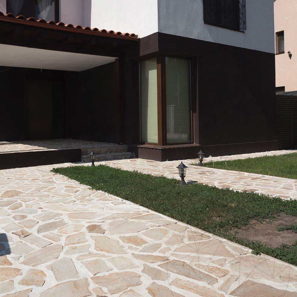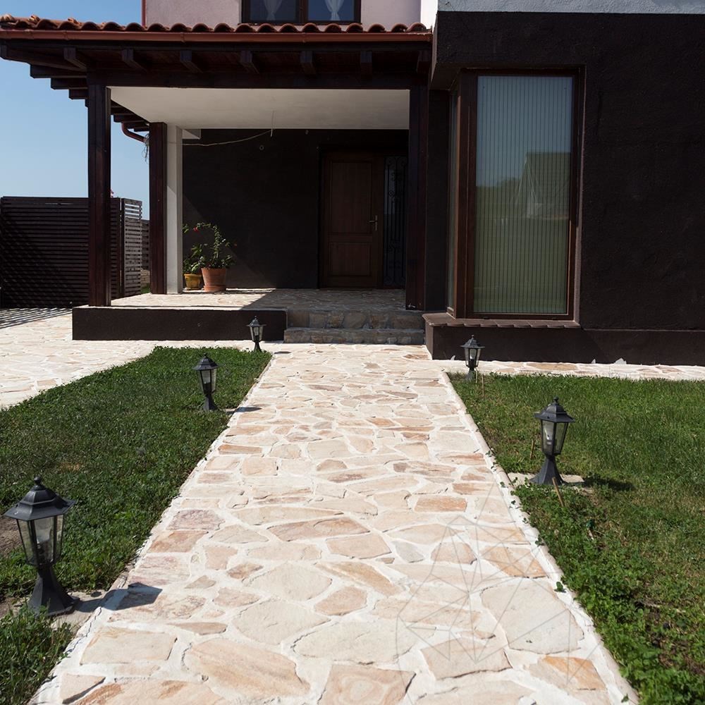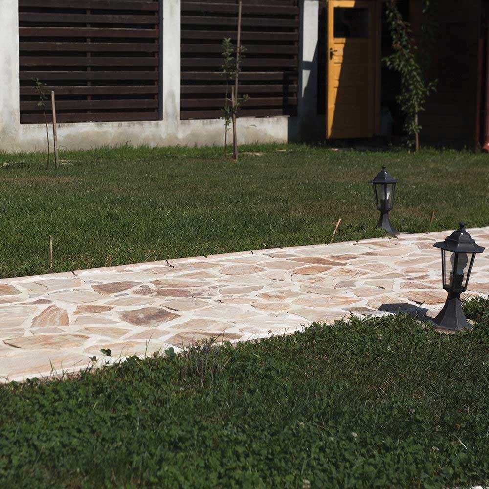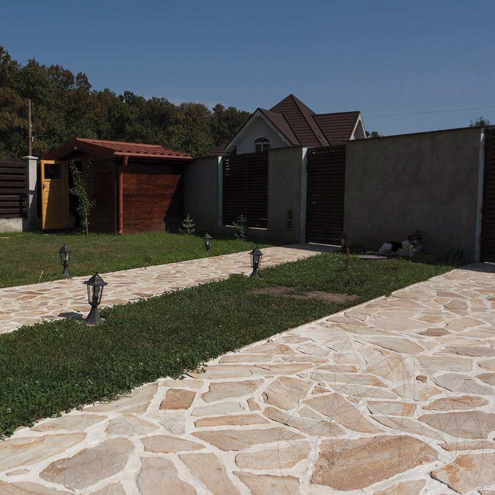Schiefer Rhodos wird fürAußenanlagearbeiten, in Gärten, für Gehwege, etc. empfohlen; es bietet einschließlich eine exzellente Lösung auch für senkrechte Verkleidungen für Fassaden, Terrassen, Zäune und Innenwände. Die Platten habe große Maßen aber bieten gleichzeitig eine große Kompositionsfreiheit und eine kürzere Verlegungszeit. Die kleinen Farbabweichungen helfen zur Erschaffung eines einheitlichen und erholsamen Aussehens. Im Falle der Pflasterungen sind diese Platten (4-10 Stk./qm) auf einem habfeuchten Estrich aufgetragen. Als Garten-oder Innendekoration ist Schiefer nicht nur robust, ästhetisch und funktional, sondern hält auch sehr gut auch beim Frost-Tau-Phänomen aus. Eignet sich für Gehwege, Gärtenschritte (japanische Schritte) und senkrechte Verkleidungen (z.B. Haussockel oder Zaunverkleidungen etc.)