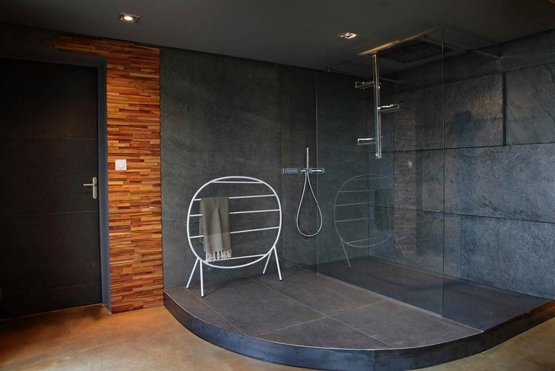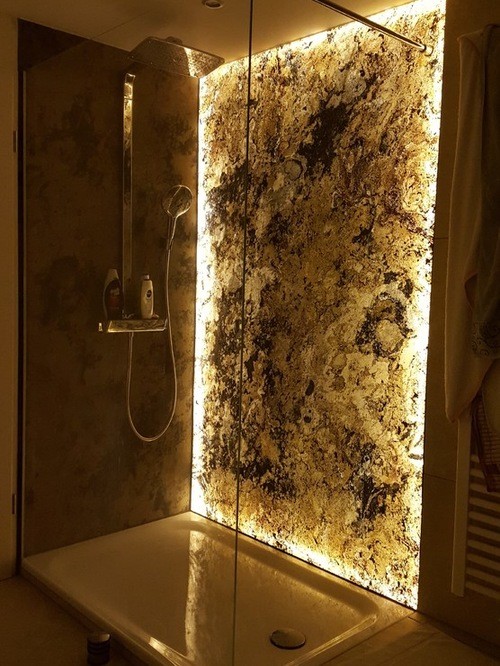 In den obigen Bildern sind die Wände der Dusche mit flexiblem Schieferfurnier verkleidet. Die Leichtbauplatten sind ideal für diese Projekte, da sie die Wände nicht belasten und zudem absolut wasserdicht sind. Und nicht zuletzt ist Schiefer elegant, modern und exotisch. Bei der Entscheidung für Schieferfurnier sind zwei Aspekte zu beachten. Stellen Sie zunächst sicher, dass die Farbe des Schiefers mit der der verwendeten Geräte übereinstimmt. Und zweitens benötigt Schiefer eine angemessene Beleuchtung, um seine besondere Textur hervorzuheben. Deshalb funktionieren die transparenten Schieferplatten, die auf dem dritten Foto abgebildet sind, so gut.