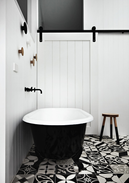Another example of bathroom decoration with oriental terrazzo tiles is element in a project designed by Whiting Architects from Australia for a private residence. With a contemporary touch, the bathroom area features black and white oriental terrazzo flooring, a perfect match for the white wooden walls.